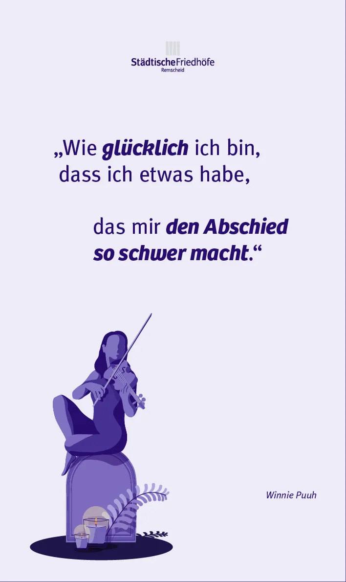 Keyvisual zum Tag des Friedhofs in Remscheid: Sonnenuntergang mit einem einzelnen Baum im Vordergrund.Keyvisual zum Tag des Friedhofs in Remscheid: Eine Frau sitzt auf einem Grabstein, der mit Kerzen und einem Farn dekoriert ist, und spielt Geige. Um die Frau herum schweben ein Brief samt Feder und ein Notenbuch.