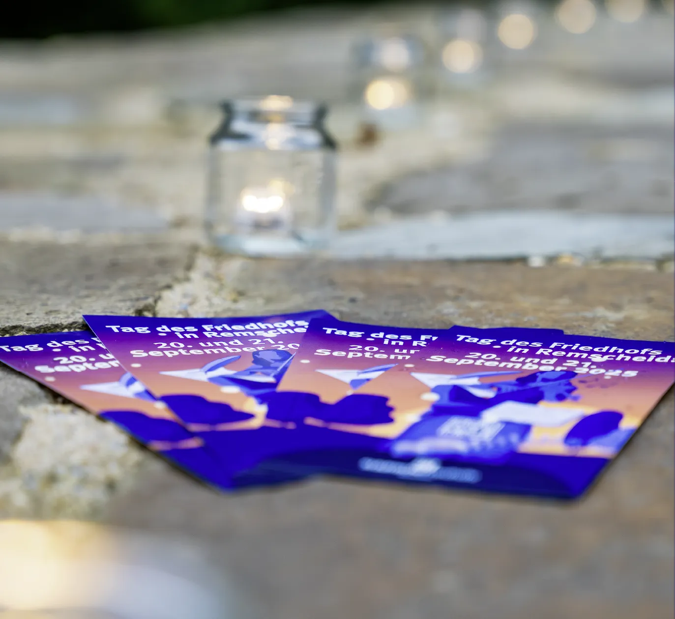 Keyvisual zum Tag des Friedhofs in Remscheid: Detail eines Grabsteins mit Kerzen und Farn.